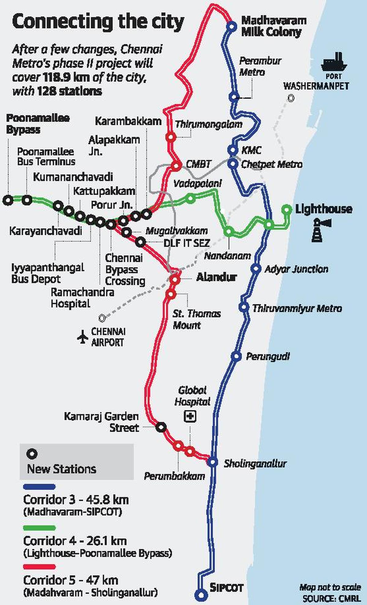The Blue Line runs from Wimco Nagar to Chennai International Airport. This line connects important residential areas, business zones, and the airport, making it very useful for daily commuters and travelers.The Green Line runs from Puratchi Thalaivar Dr. M.G.R Central Metro to St. Thomas Mount. This route connects Chennai Central Railway Station with southern parts of the city.Both lines intersect at key stations like Alandur and Central, allowing easy interchange.